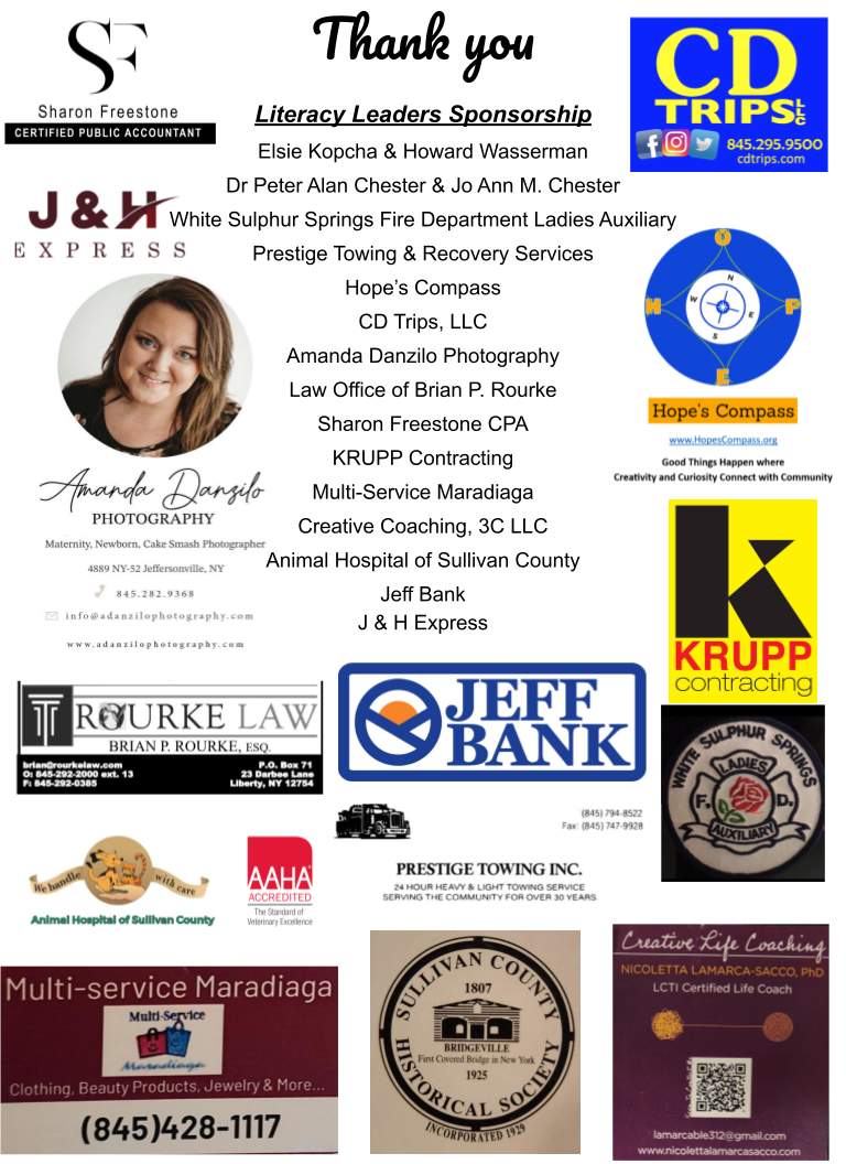 It was our pleasure to have Connie Keller from Sullivan County Literacy Volunteers visit at our last meeting and tell us all the good things that are happening at her organization. Tutoring is currently occurring in Monticello, Fallsburg, Liberty, and Jeffersonville. Additionally, newer programs including Story Time for Children, Financial Literacy, and Health Literacy have been added to assist our community.